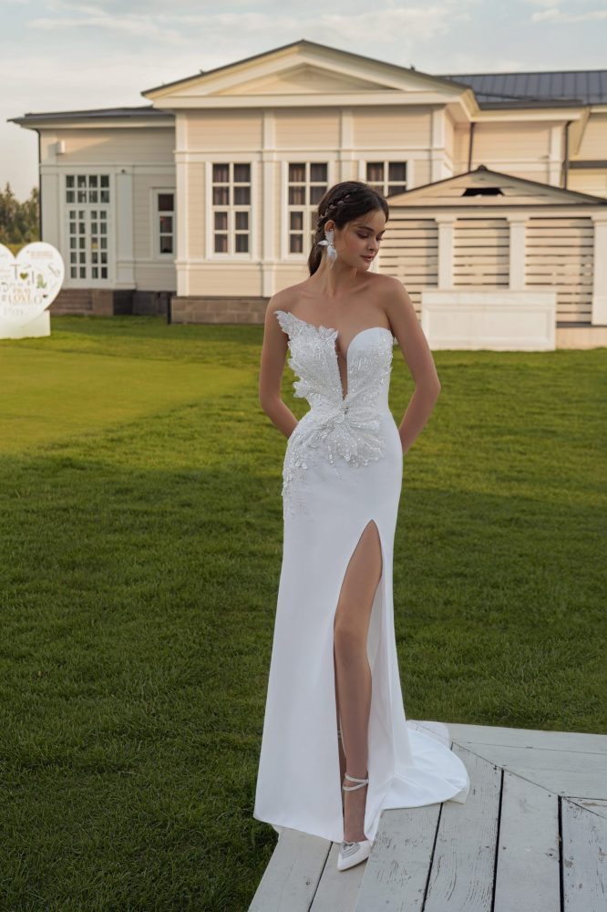 Мерцающее свадебное платье прямого кроя, без рукавов. Полупрозрачная юбка эффектно подчёркивает силуэт. Это свадебное платье – прекрасный выбор для тех, кто ищет что-то смелое и необычное. Оно подойдет как для свадьбы на пляже, так и для торжества в городском формате.