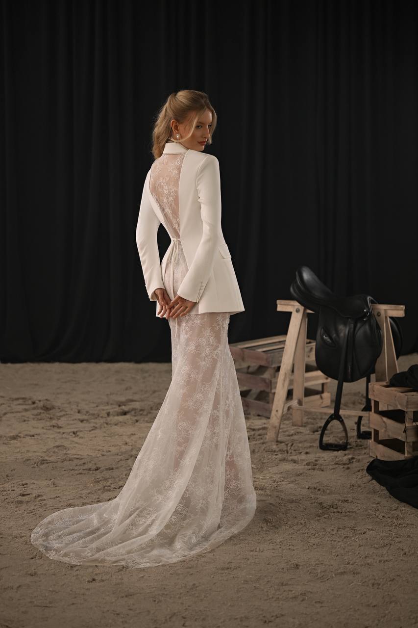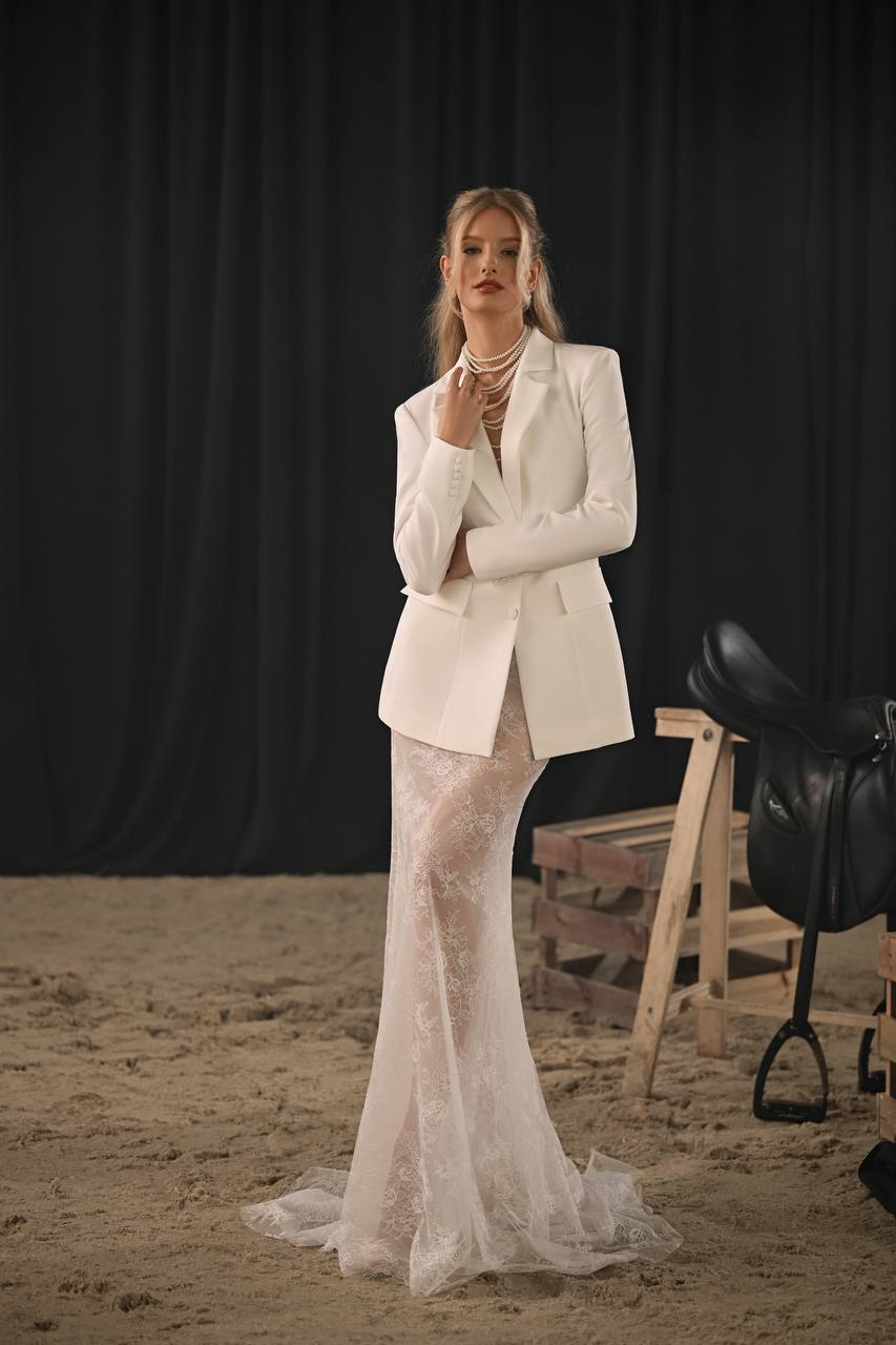 Современная интерпретация классики. Комплект из приталенного жакета и кружевной юбки создаёт баланс силы и чувственности. Прозрачная спинка добавляет хрупкости, а строгий крой — уверенности.