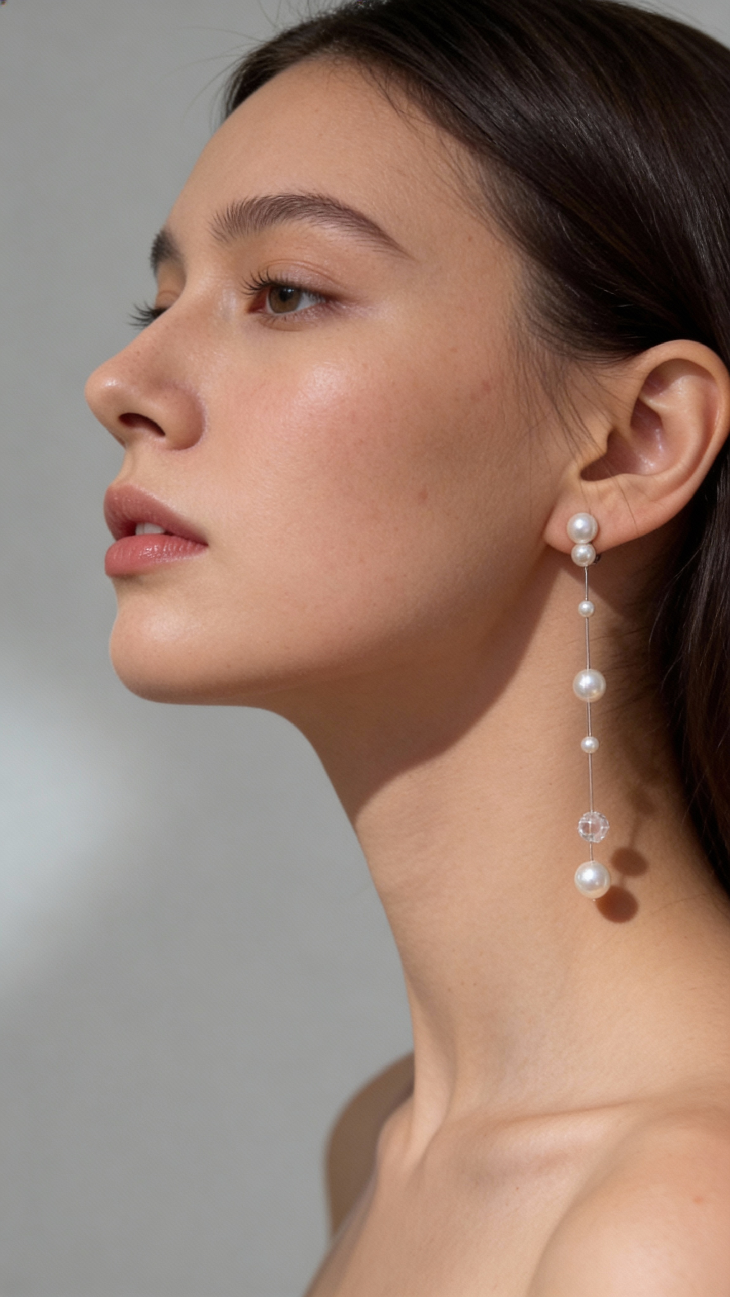 Тонкая вертикаль, которая красиво подчёркивает шею и профиль. Жемчуг словно парит в воздухе, создавая ощущение лёгкости и утончённого движения. Эти серьги добавляют образу глубины и делают его запоминающимся — без лишней демонстративности.