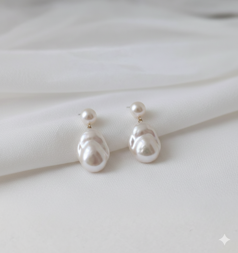 Акцентные серьги с барочным жемчугом — для образов, где важны детали. Жемчуг с естественной формой мягко ловит свет и добавляет образу глубины.