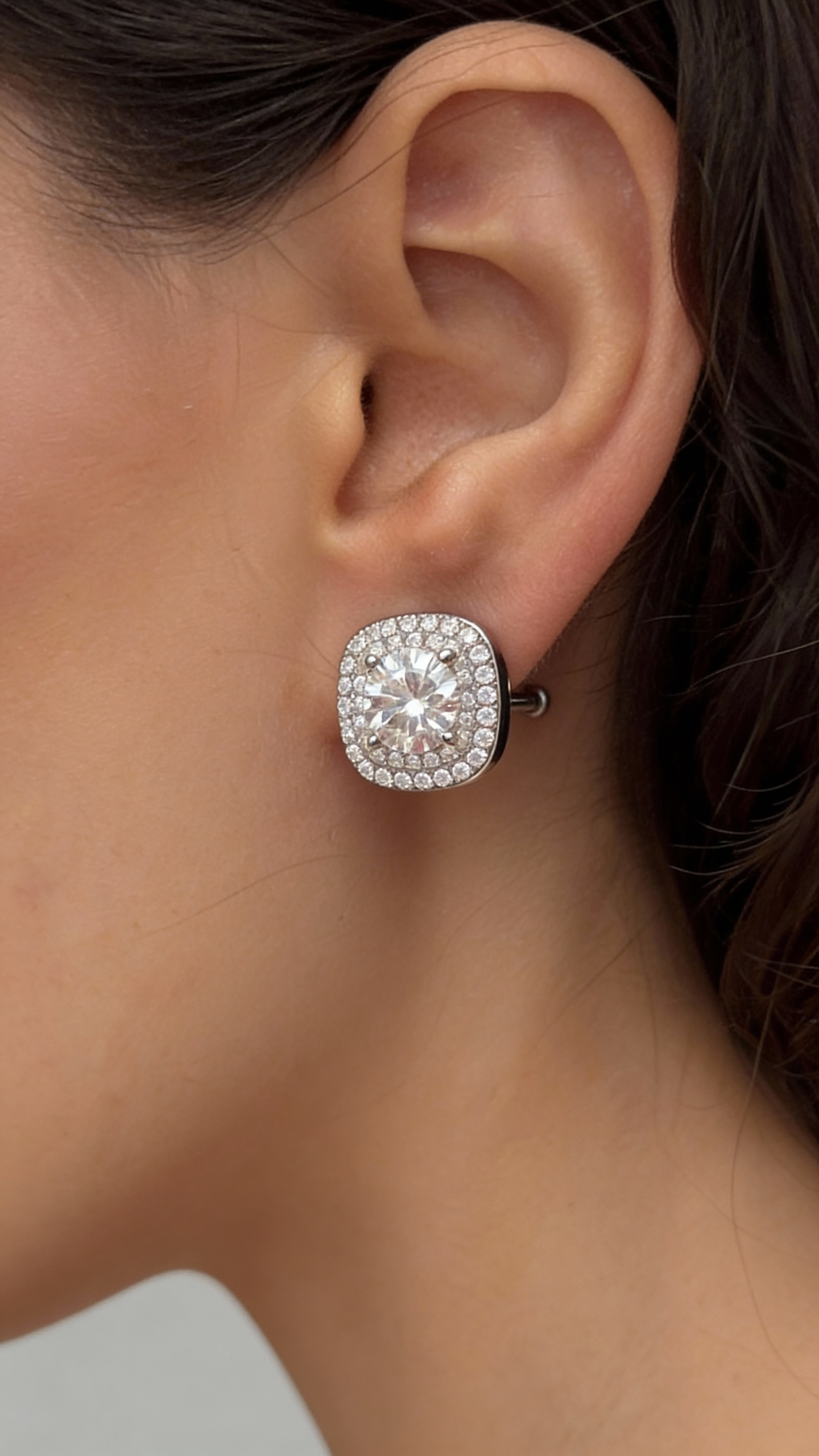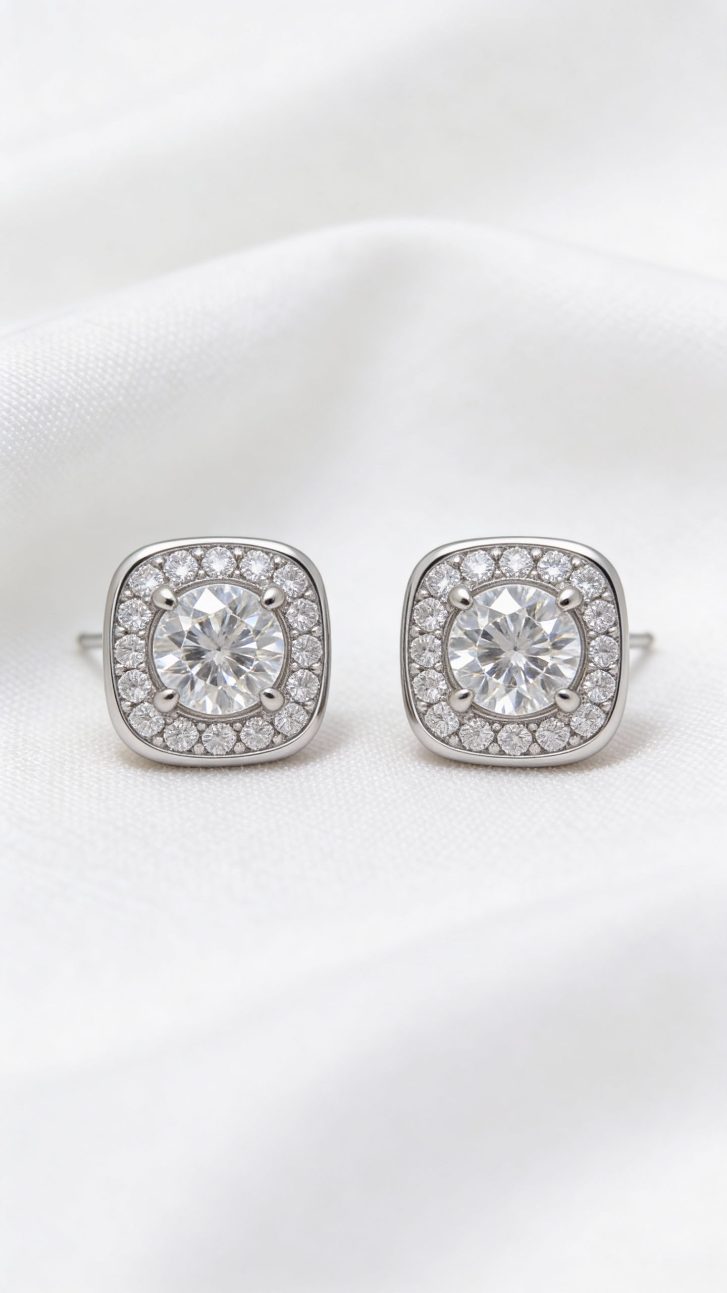 Серьги-пусеты с центральным камнем и сияющим обрамлением выглядят собранно и ювелирно точно. Квадратная форма с мягкими углами подчёркивает камень в центре и даёт аккуратный, уверенный блеск без излишней декоративности.