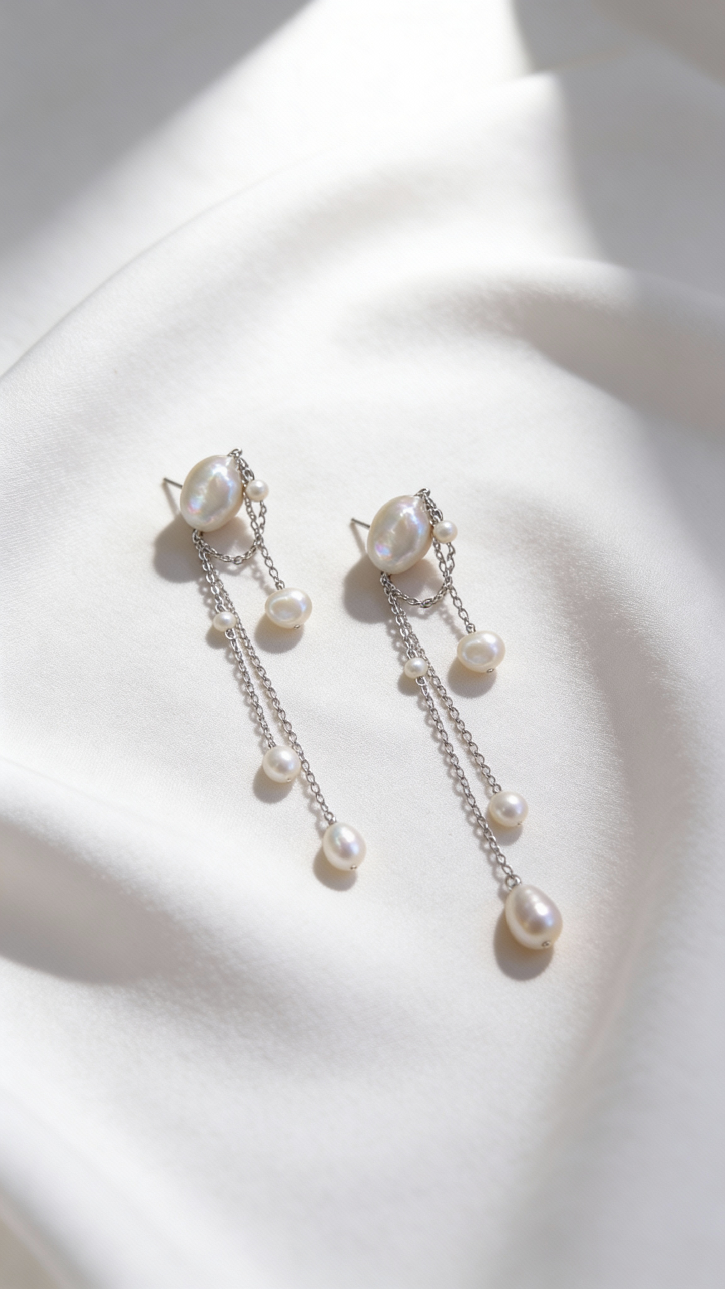 Серьги с барочным жемчугом и тонкими цепочками создают эффект лёгкого движения и многослойности. Крупный барочный жемчуг у основания добавляет фактуры и глубины, а ниспадающие подвесы с жемчужинами мягко ловят свет при каждом шаге.