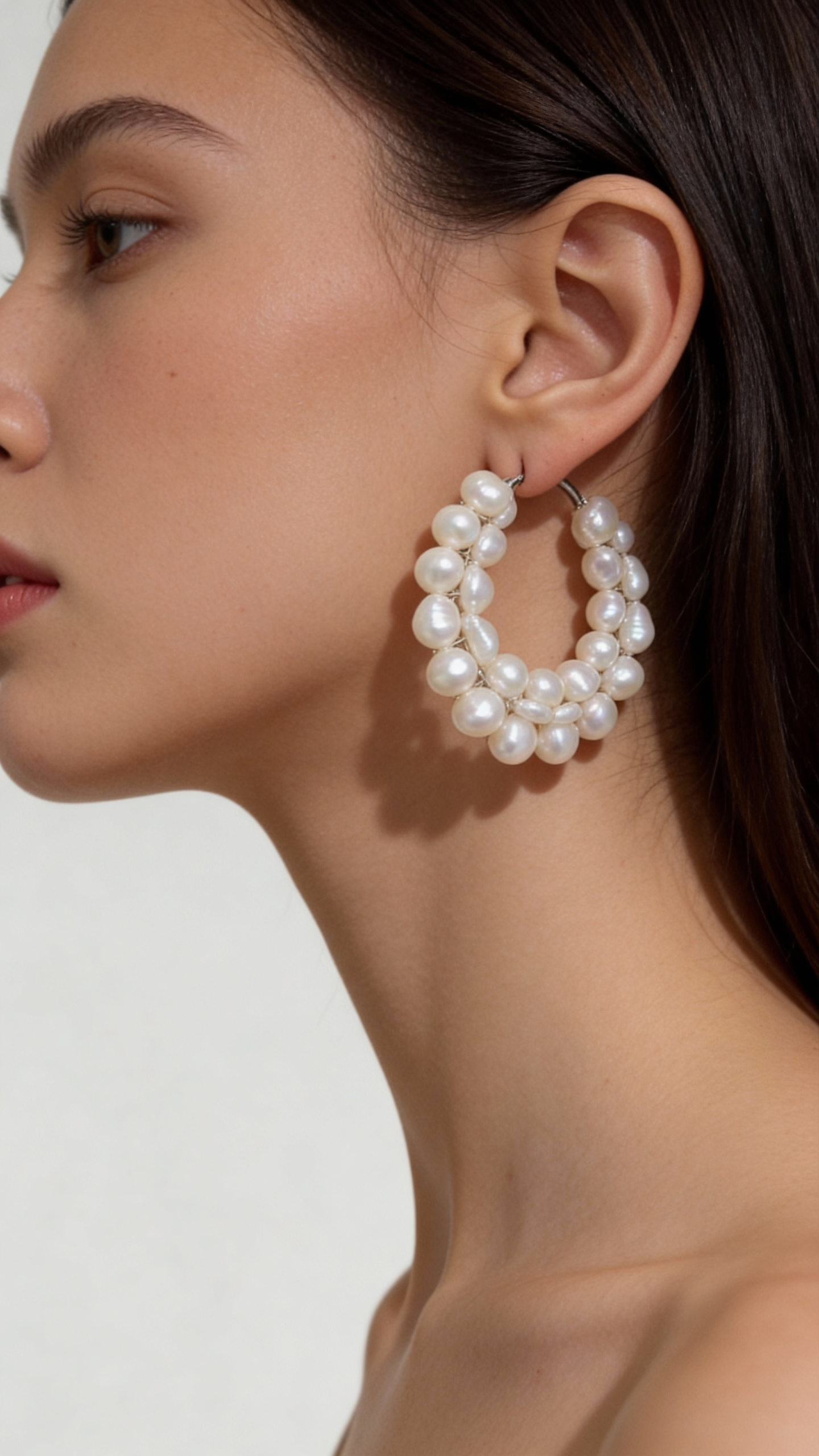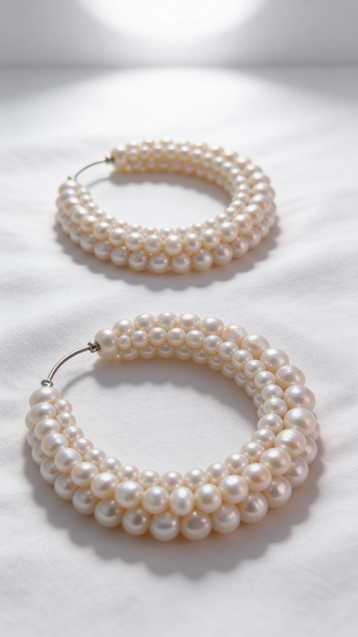 Серьги-кольца с жемчугом создают выразительный, но тёплый акцент. Многослойная композиция из жемчужин добавляет объёма и фактуры, а округлая форма делает образ собранным и гармоничным.