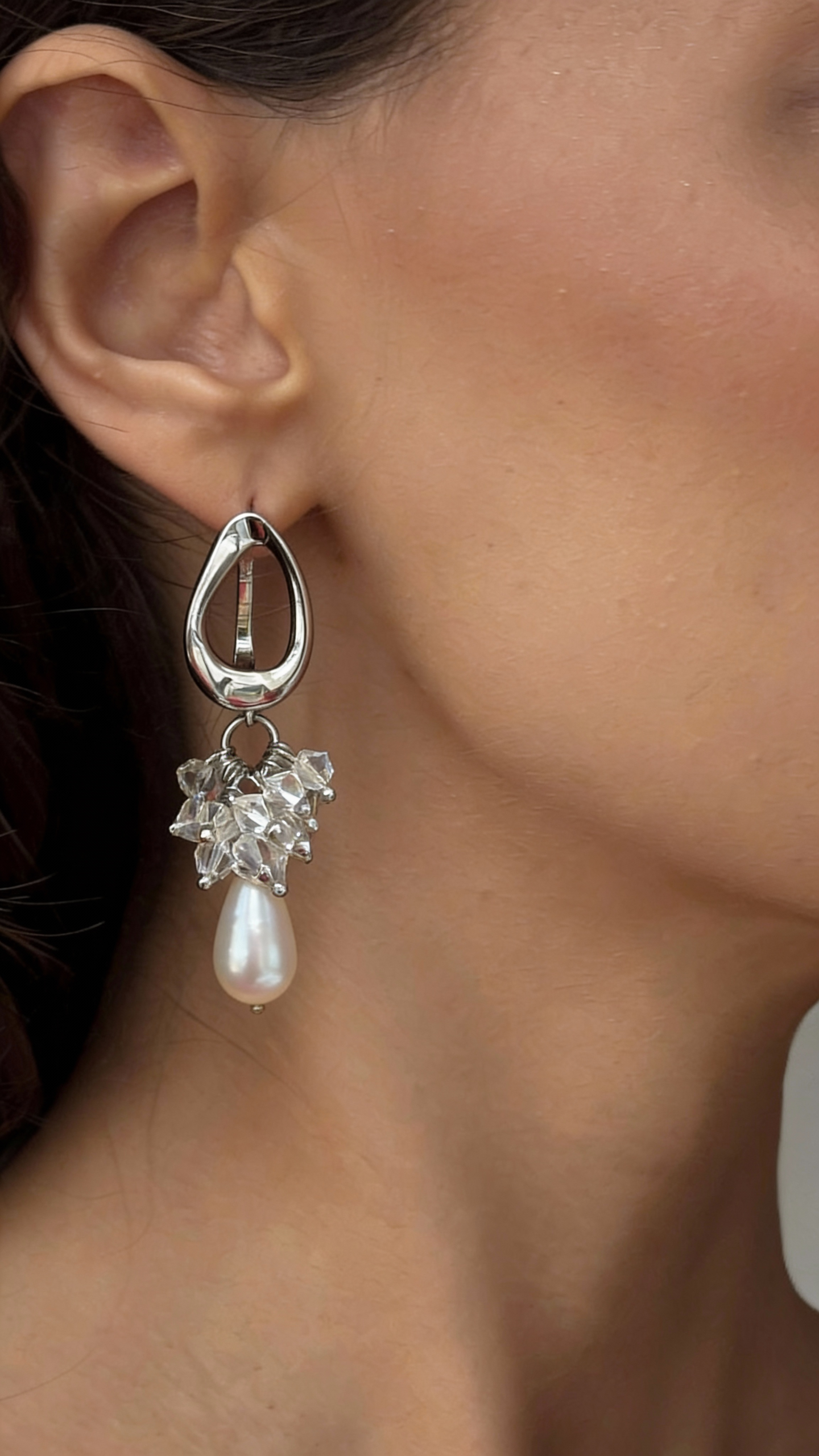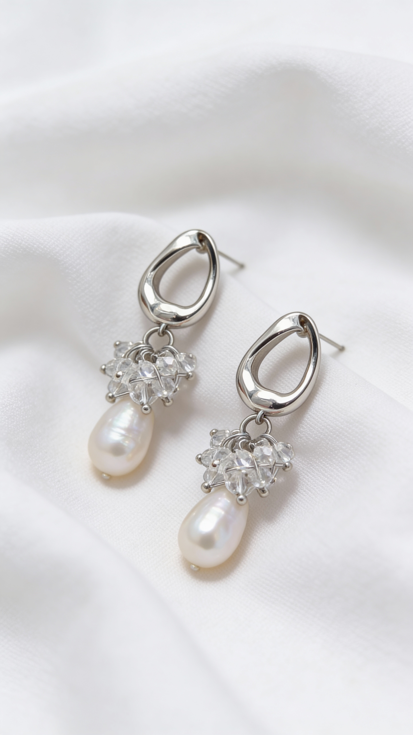 Серьги с гладкой металлической формой, прозрачными кристаллами и жемчужной подвескойсоздают ощущение света и движения. Лаконичная верхняя часть уравновешивает фактурный кластер из прозрачных элементов, а жемчужная капля внизу добавляет образу завершённость и лёгкую торжественность.