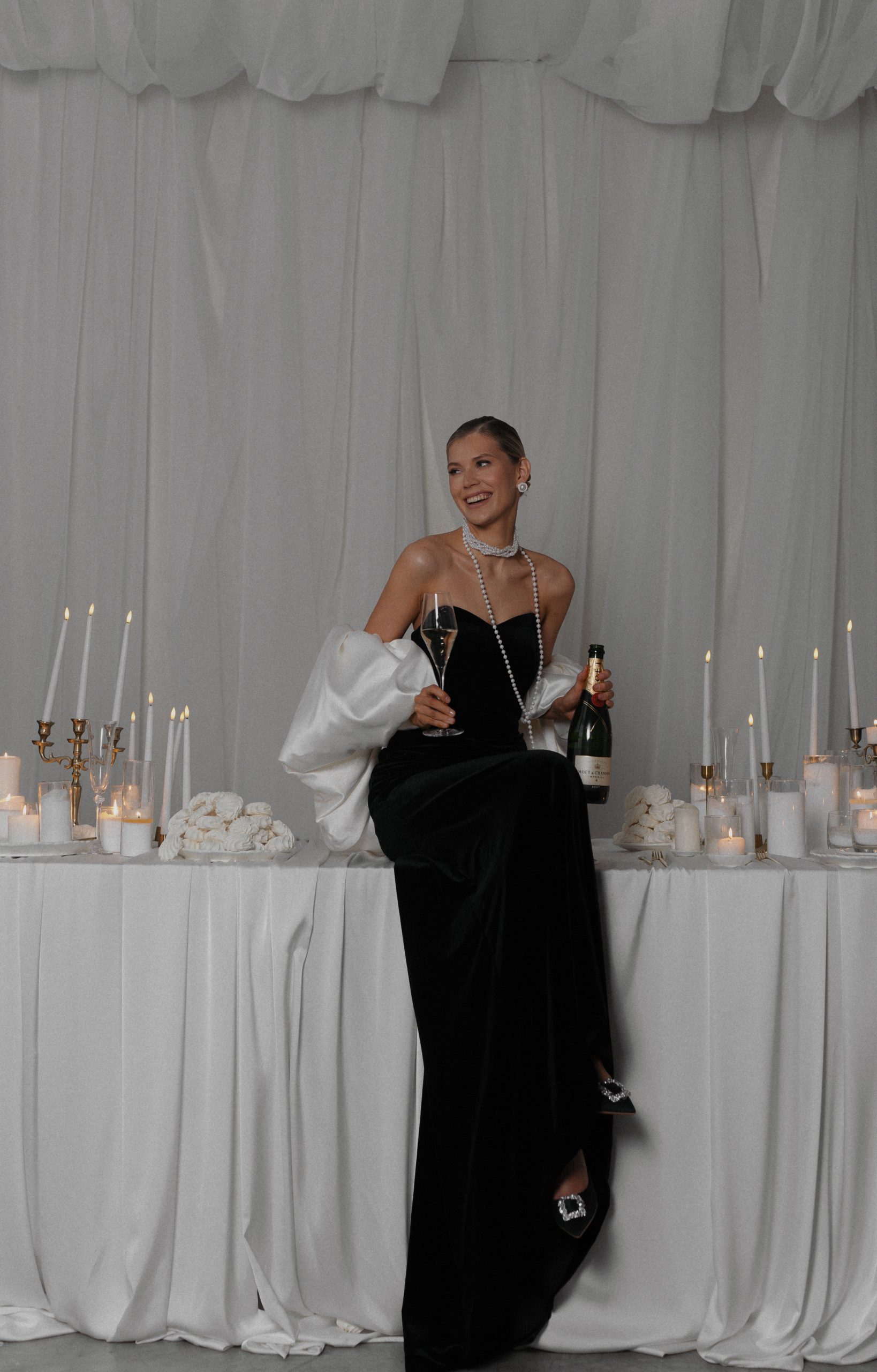 Игра на контрастах и уверенная женственность. Лаконичное чёрное платье в пол подчёркивает фигуру и создаёт эффект вытянутого силуэта, а объёмное белое болеро добавляет образу драматичности и настроения. Минимализм и выразительные детали делают образ сильным и запоминающимся.