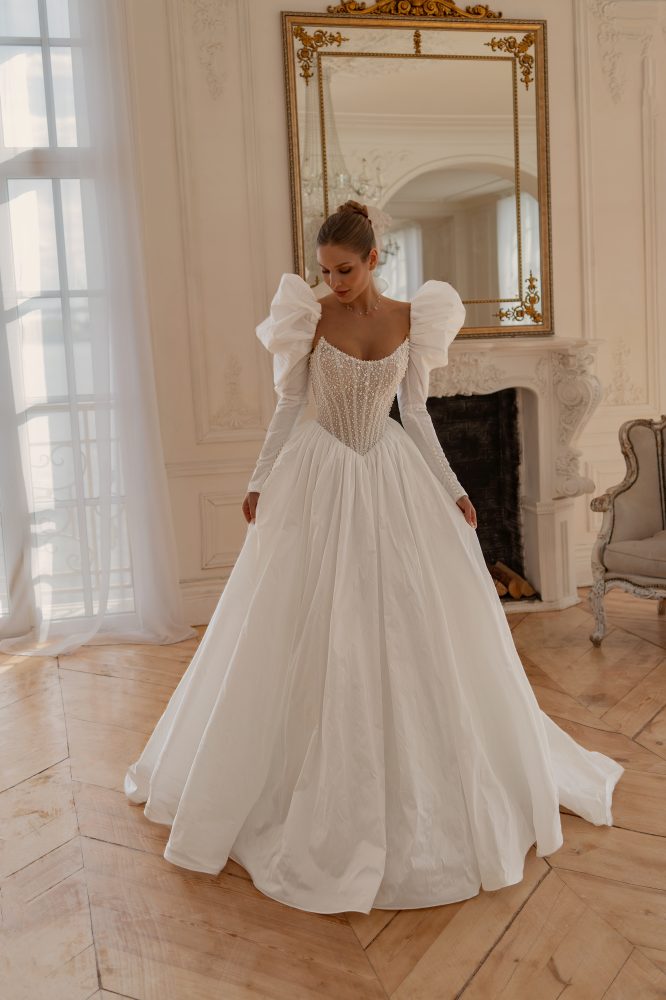 Как кадр из старого голливудского фильма. Атласное сияние, акцент на талии, длинные перчатки и изящная вышивка по лифу — в этом образе всё про изысканность и шик. Платье будто создано для выхода по лестнице под вспышки камер.