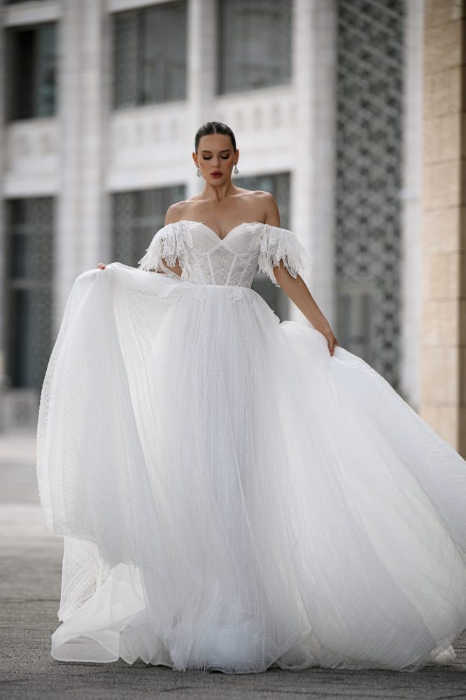 Уитни — это откровенный корсет с графичными вставками, лёгкая юбка с высоким разрезом и драпировка, которая двигается вместе с тобой. Оно про свободу, уверенность и ту женственность, которая не нуждается в лишних словах. Идеально для второго выхода, церемонии у воды или свадьбы, где хочется быть дерзкой и нежной одновременно.