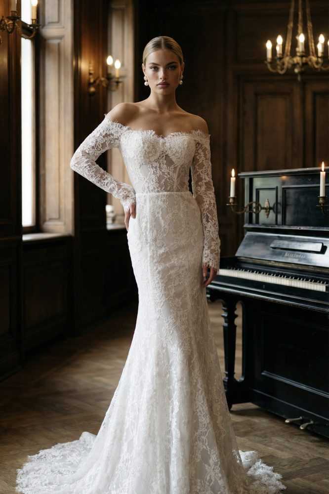 Фигурный корсет мягко открывает плечи и подчёркивает ключицы, а ниспадающая драпировка создаёт эффект лёгкой вуали, будто платье обнимает тебя. Полотно усыпано мерцающими нитями и бисером — они вытягивают силуэт и дают тот самый эффект «свечения изнутри» на каждом шаге.