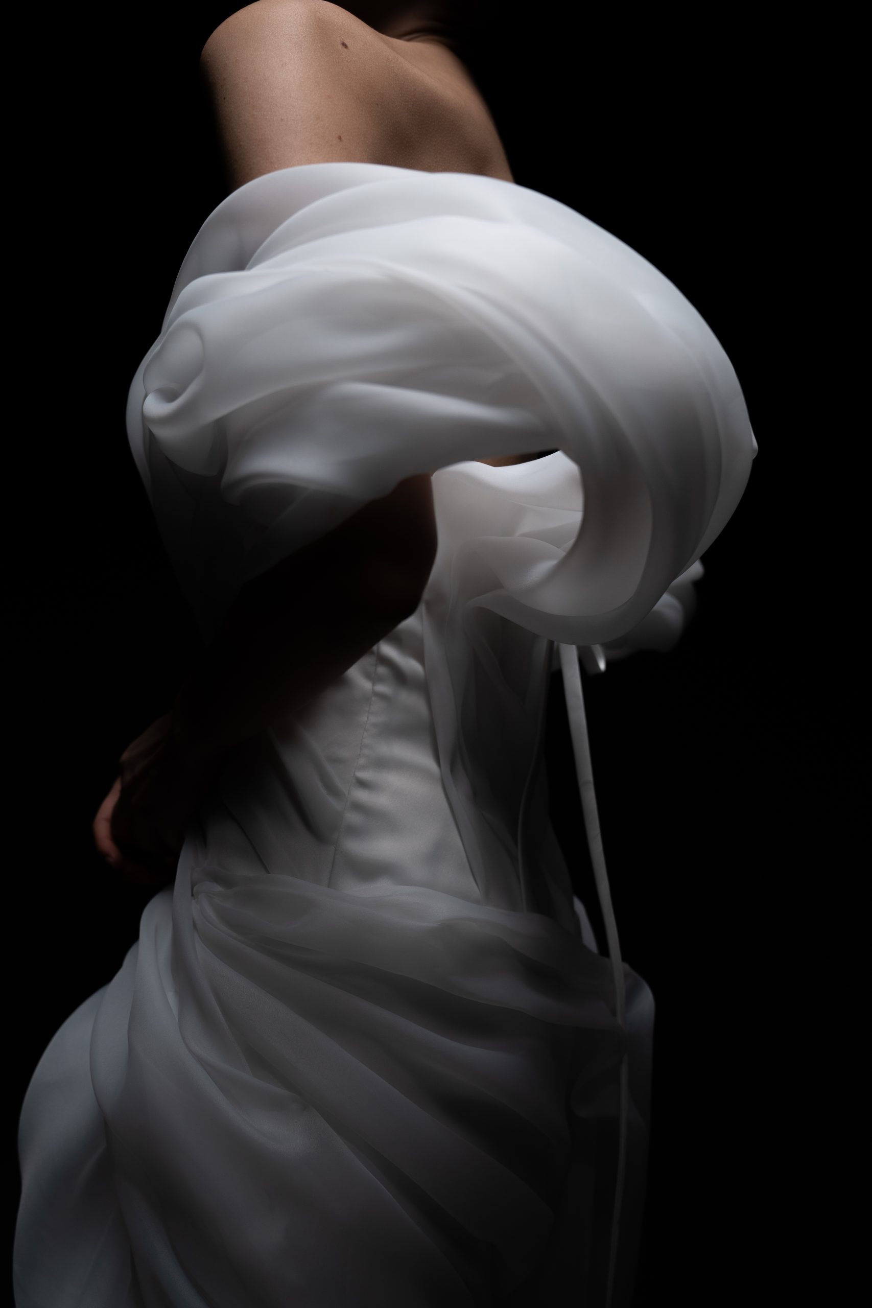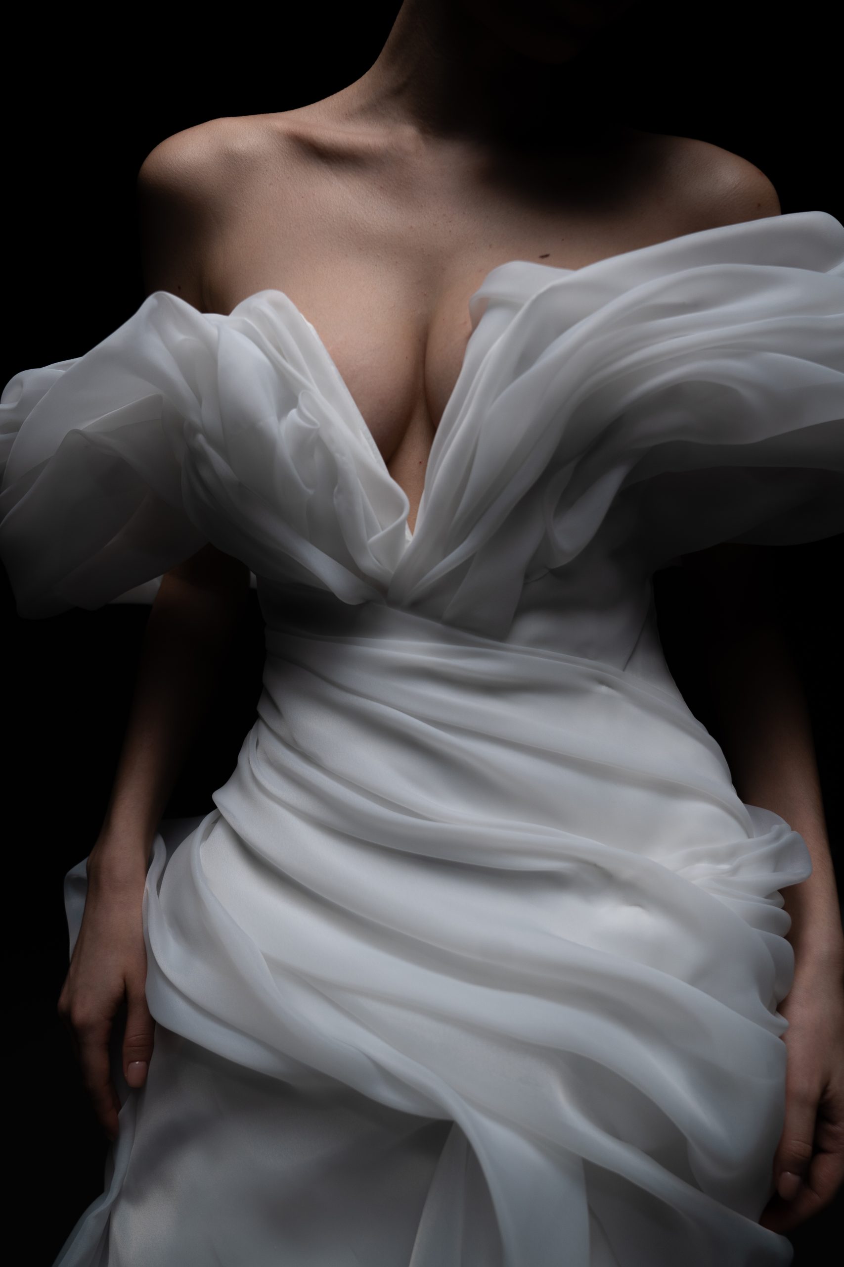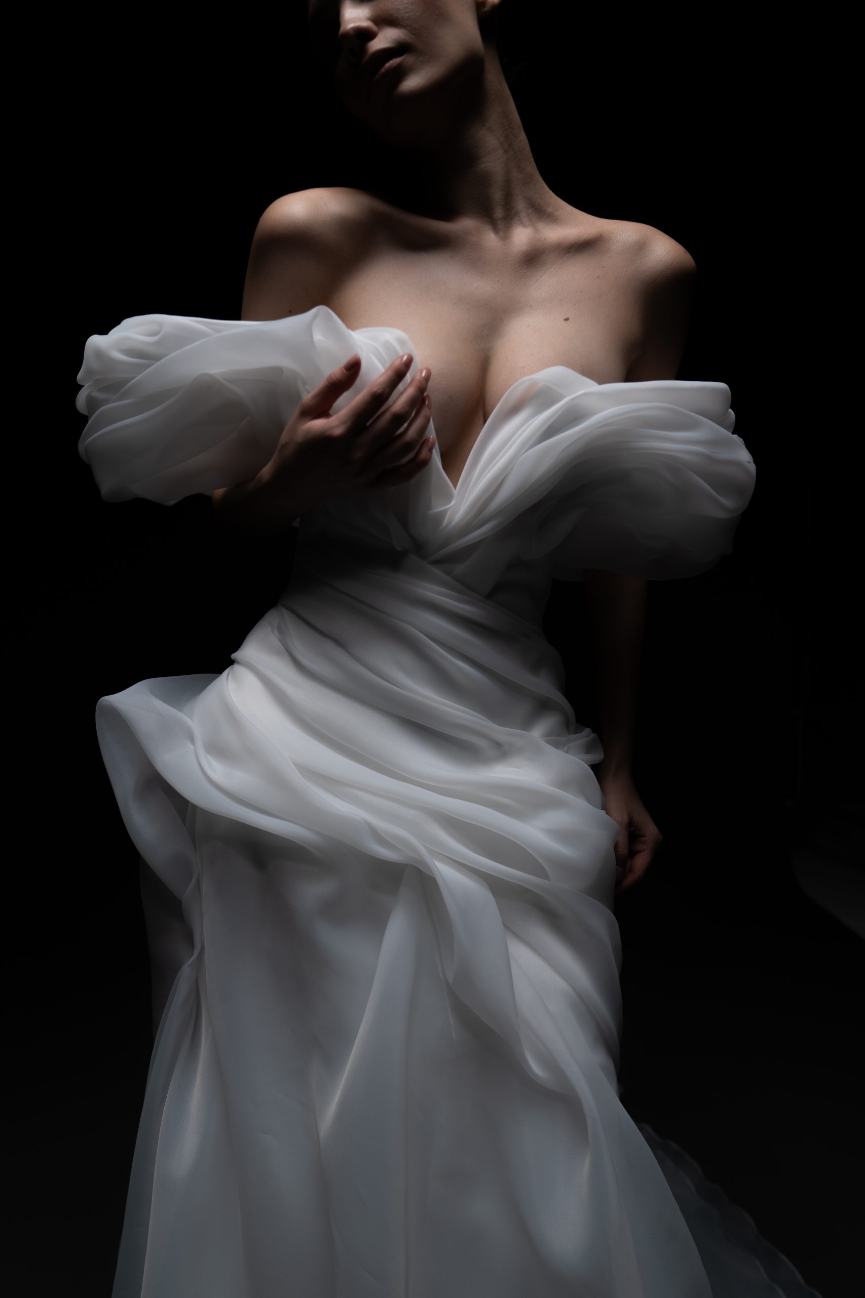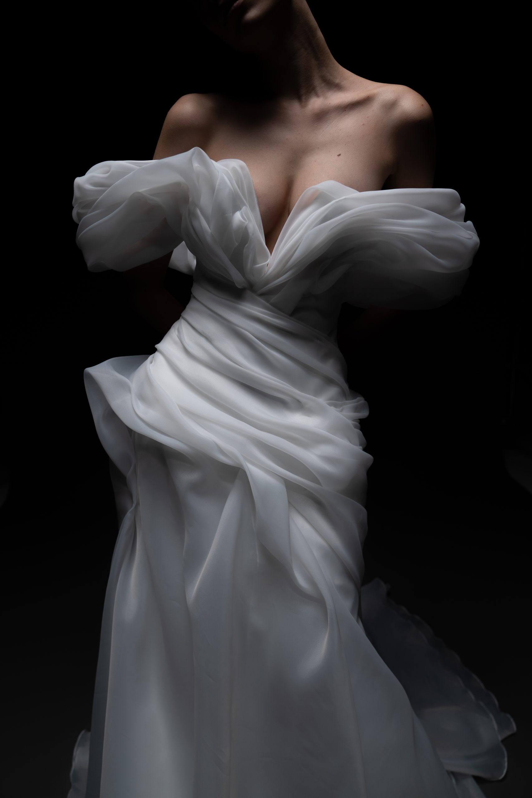 Платье, в котором ткань буквально дышит светом. Воздушные, текучие слои органзы обнимают плечи и создают эффект живого облака — лёгкого, но невероятно выразительного. Глубокий изящный вырез подчёркивает линию ключиц, а драпировка на лифе и юбке формирует тот самый скульптурный силуэт, который хочется рассматривать бесконечно.