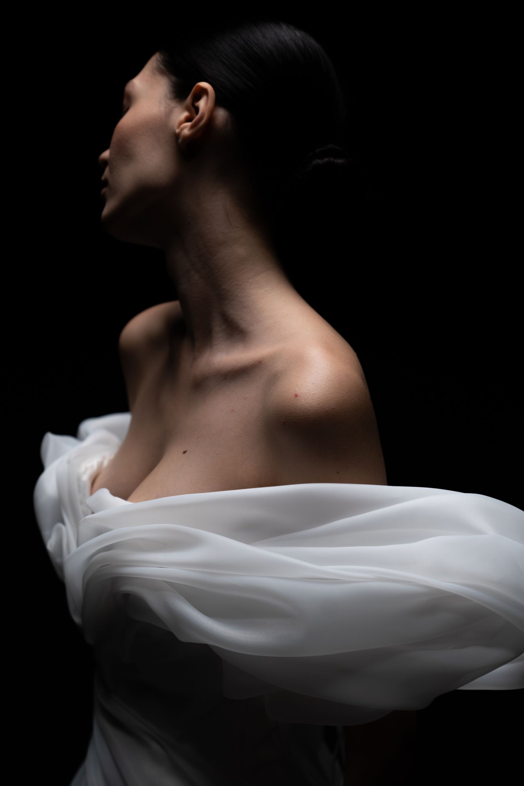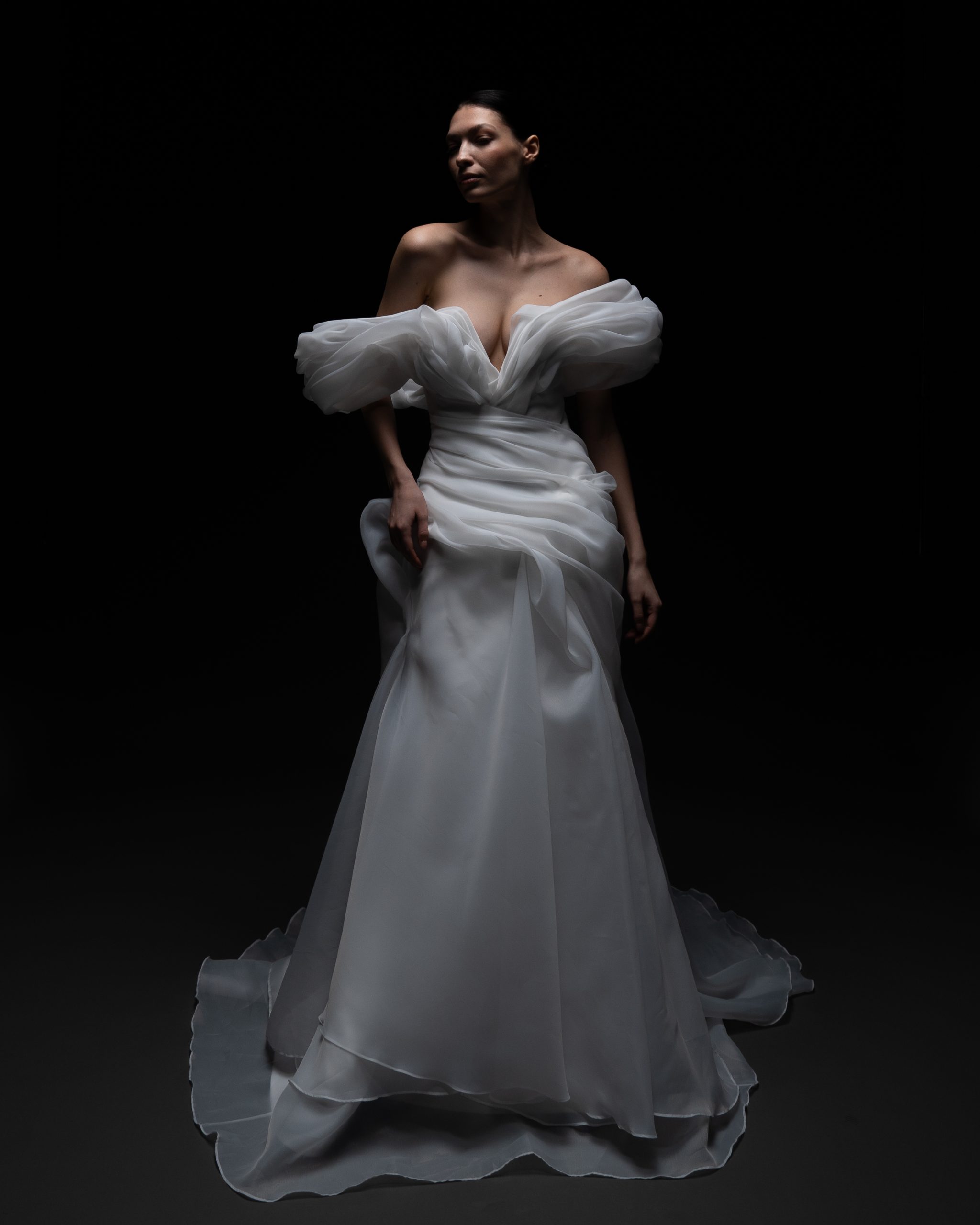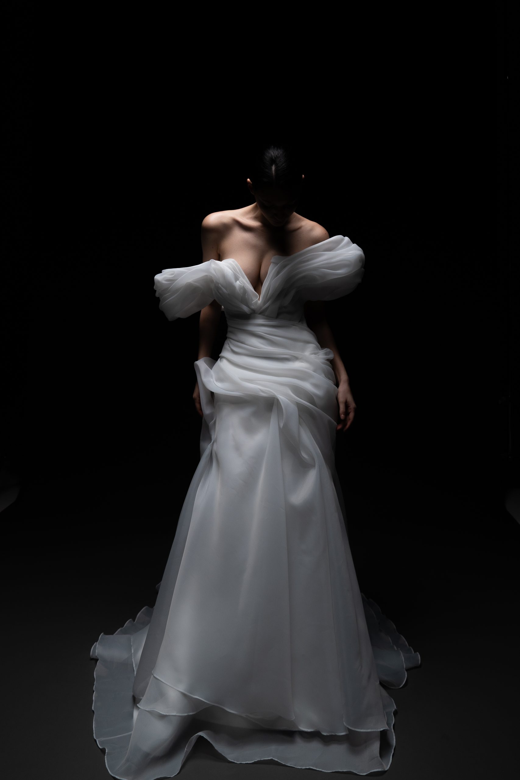 Платье, в котором ткань буквально дышит светом. Воздушные, текучие слои органзы обнимают плечи и создают эффект живого облака — лёгкого, но невероятно выразительного. Глубокий изящный вырез подчёркивает линию ключиц, а драпировка на лифе и юбке формирует тот самый скульптурный силуэт, который хочется рассматривать бесконечно.