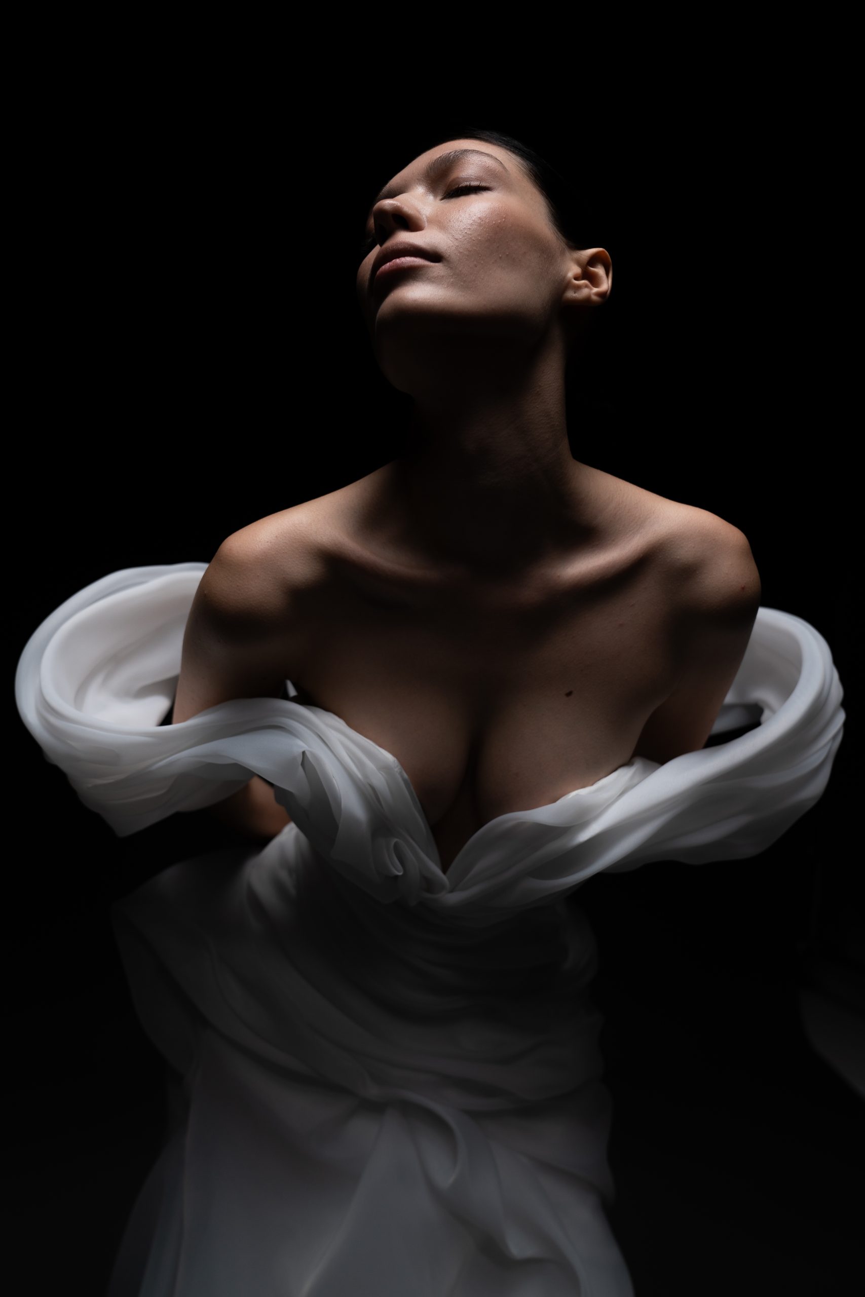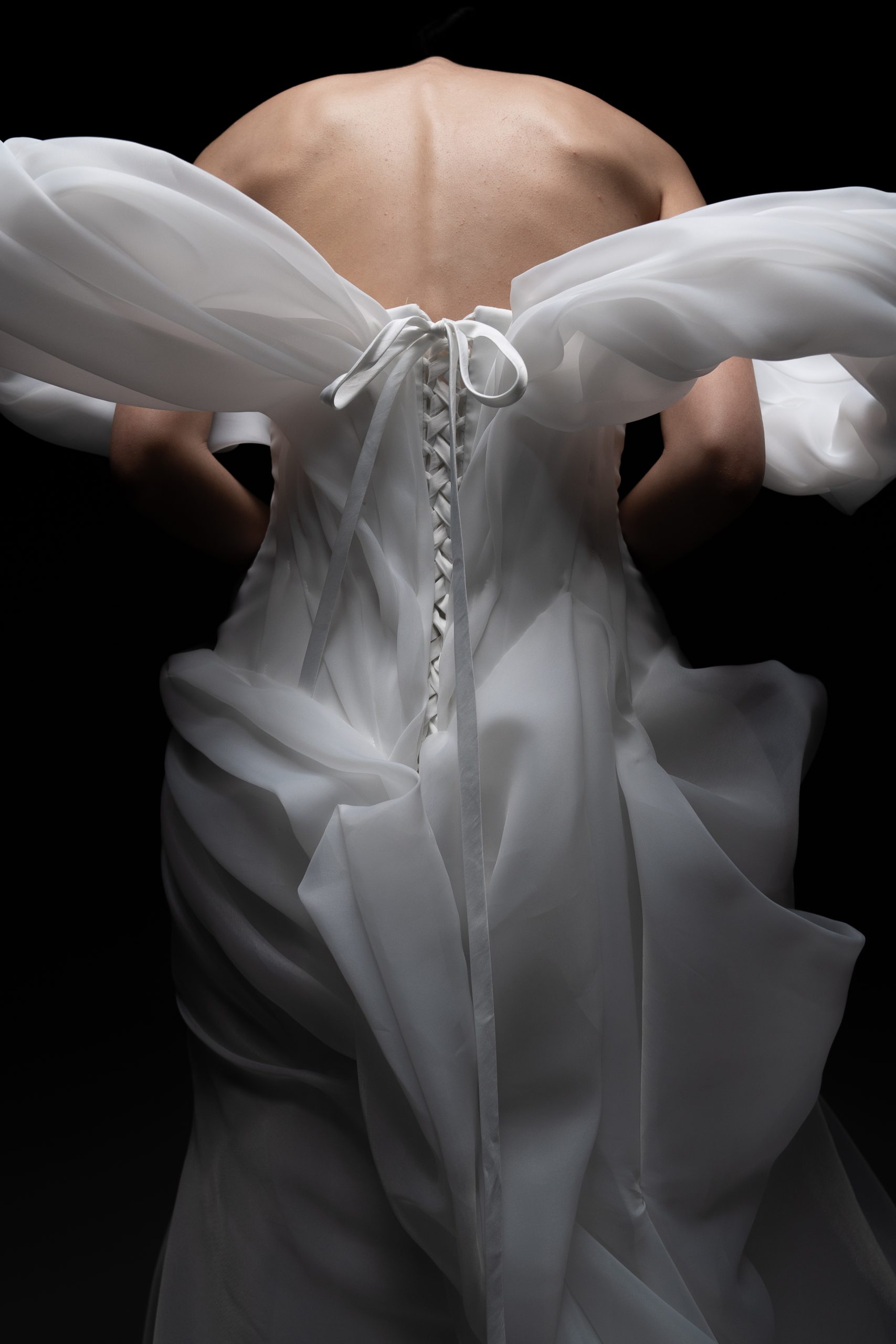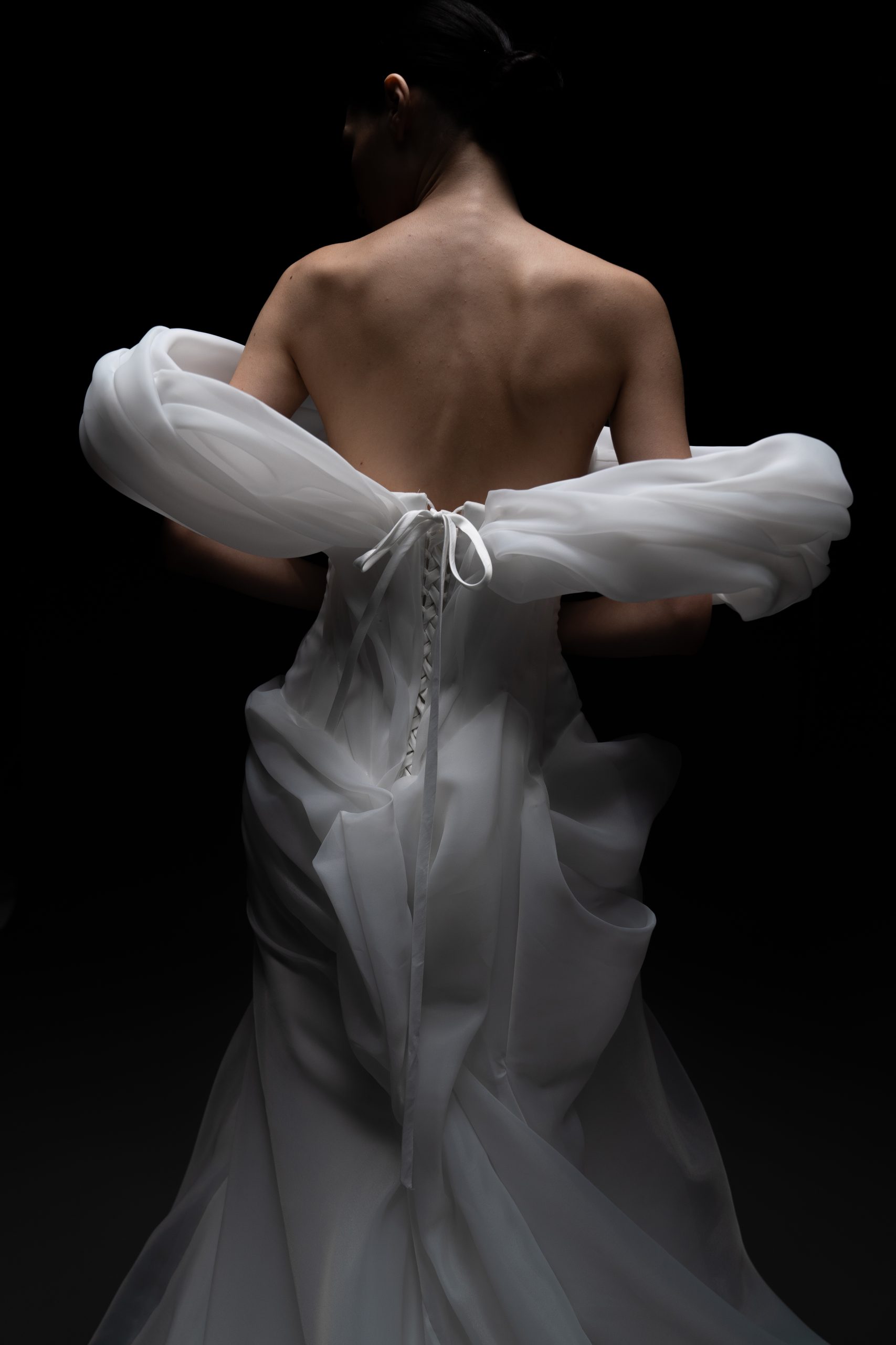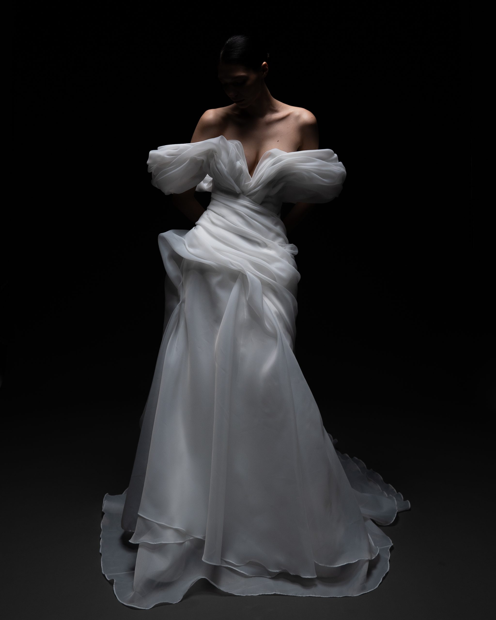 Платье, в котором ткань буквально дышит светом. Воздушные, текучие слои органзы обнимают плечи и создают эффект живого облака — лёгкого, но невероятно выразительного. Глубокий изящный вырез подчёркивает линию ключиц, а драпировка на лифе и юбке формирует тот самый скульптурный силуэт, который хочется рассматривать бесконечно.