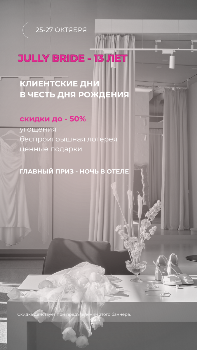 В этом году мы отмечаем не просто дату — мы празднуем мечту, которая выросла из шести платьев до сети самых девчачьих салонов в России. С 25 по 27 октября в салоне Jully Bride пройдут клиентские дни, тебя ждут розовые сюрпризы, комплименты, праздничное настроение и скидки до 50%