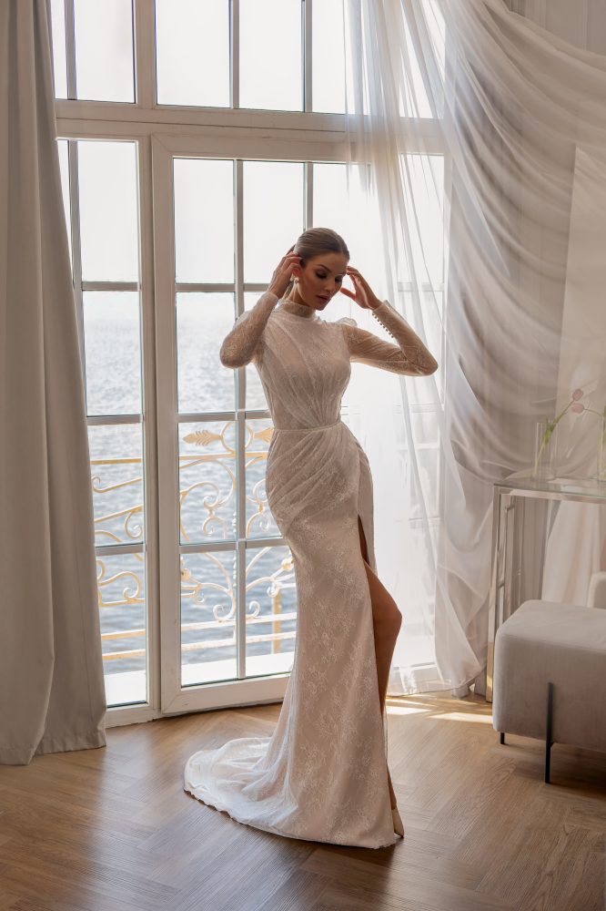 Это платье для той, кто ценит утонченность, но не боится заявить о себе. Корсет с прозрачными кружевными рукавами создает невероятно утонченный силуэт, а украшение из бисера и кристаллов на юбке добавляет блеска и роскоши. Каждая деталь платья Беатрис расскажет о твоем изысканном вкусе и уверенности.